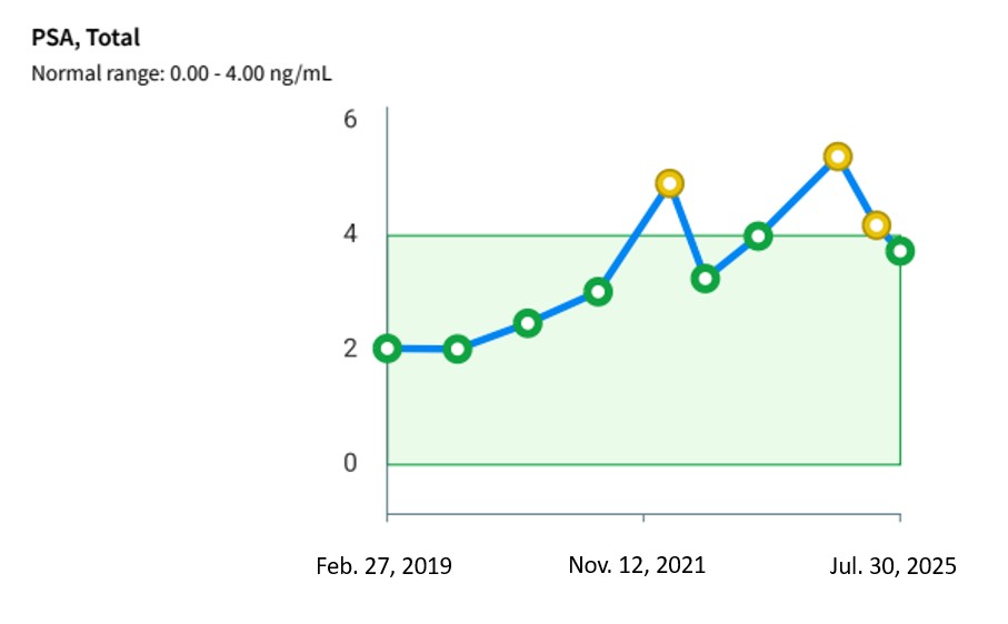 The lab results from my Prostate-Specific Antigen (PSA) Test on July 30, 2025, was down to 3.73. On September 4, 2024, it was 5.38. On March 27, 2025, it was 4.18, and yesterday, Wednesday July 30, 2025, it was 3.73.